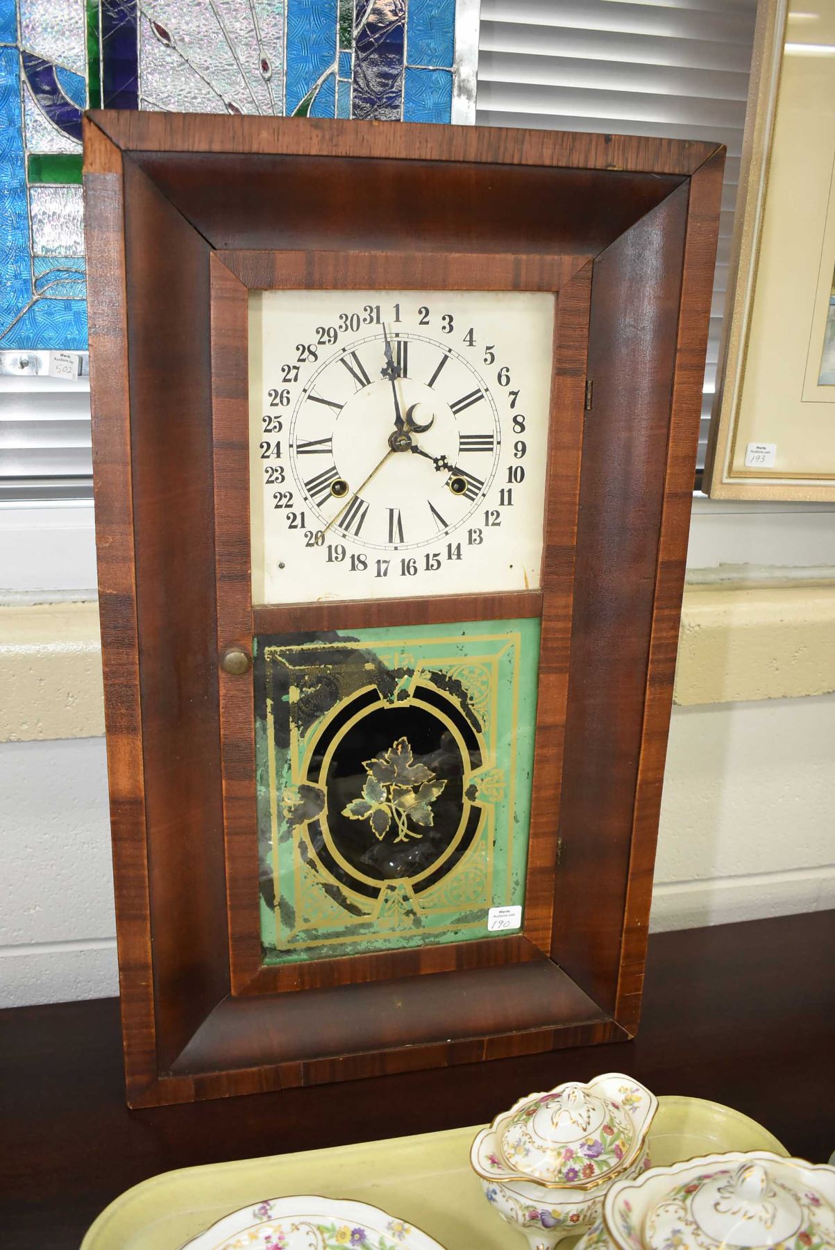Antique Wood Cased Eight Day Clock Made By Southern Clock Company With Reverse Painted Glass Panel