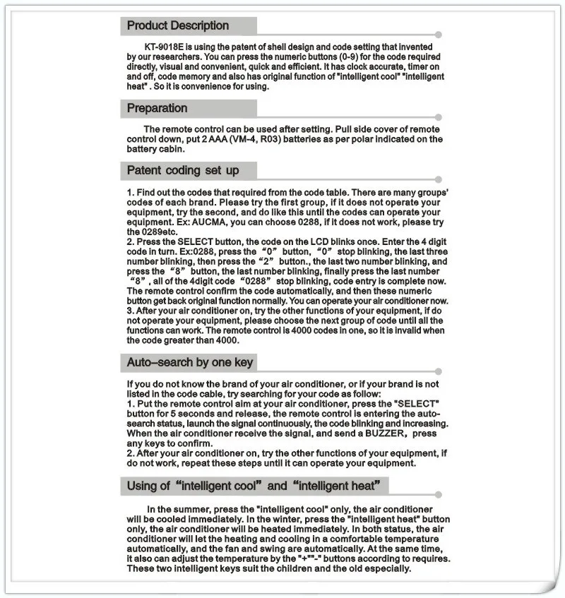 Common Mode vs Intelligent Mode Common Mode – Unit will cycle depending on the temperature of the evaporator coil only. KT9018E Controle Universal A/C Descrição do produto KT9018E é usar a patente de projeto do escudo e configuração de código que inventado por nossos pesquisadores Você pode pressionar os botões numéricos (09) para o código necessário diretamente, visual e conveniente, rápido e eficiente. In this section A collection of hundreds of original universal remote control manuals and preprogrammed code lists Finally, get exactly what you need to program your remote!.