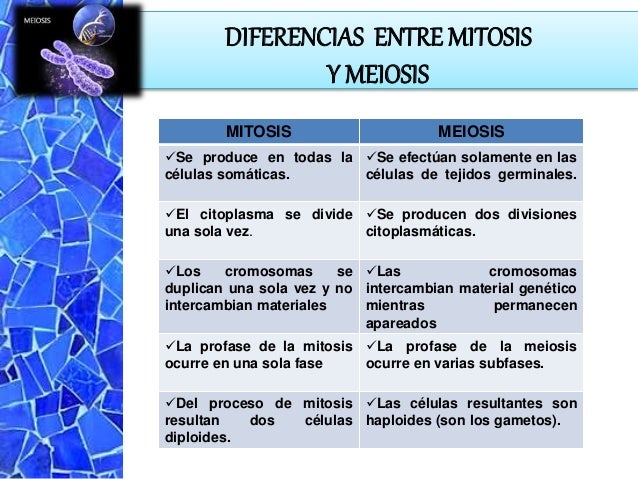 Diferencias mitosis y meiosis y la reproducción celular En este vídeo se presentan una serie de diferencias entre los procesos de mitosis y meiosis dentro d. La mitosis y la meiosis son procesos naturales muy importantes para la reproducción, crecimiento y otros cambios en la vida de los seres vivosTodos los seres vivos tienen células que llegan a un momento en el cual deben dividir y multiplicarse, este proceso es el que se denomina mitosis Este mecanismo permite que la célula multiplique su información genética y la parte en dos mitades. Semejanzas entre Mitosis Meiosis 1) Tanto en la mitosis como en la meiosis se parte de células diploides (2n) 2) En la interface, antes de la mitosis o meiosis, se produce la duplicación del material genético 3) Los husos acromáticos están constituidos por los mismos tipos de micro túbulos y su funcionamiento es similar.