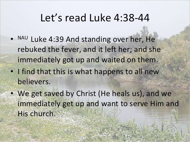 Gospel luke 4 38 44. Luke was a physician (Colossians ) and likely accompanied Paul on three of four missionary journeys as described in Acts (the "we" passages from Acts 161 to Acts 2816) It is possible that the date of composition of Luke's Gospel was before 70 AD According to the introduction of Acts, the Gospel of Luke was written first. 4 And Jesus answered him, saying, It is written, That man shall not live by bread alone, but by every word of God 5 And the devil, taking him up into an high mountain, shewed unto him all the kingdoms of the world in a moment of time. Luke (ESV) And he arose and left the synagogue and entered Simon’s house Now Simon’s motherinlaw was ill with a high fever, and they appealed to him on her behalf A And he stood over her and rebuked the fever, and it left her, and immediately she rose and began to serve them.