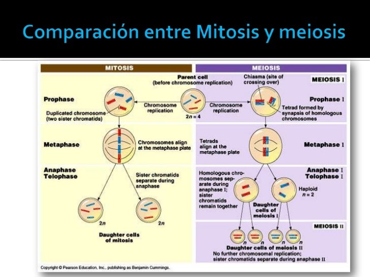 Comparación entre Mitosis y Meiosis Figura 1 Comparación entre Mitosis y Meiosis REFERENCIAS Granados V Sf Curso de ambientación universitaria Universidad Nacional de José C Paz Células procariotas y eucariotas Pág 134 del ADN Los de as División I normal ción del ADN Division. Respuesta la comparacion es que la mitosis se produce en celulas somaticas mientras que la meiosis solo se produce en las celulas madres de los gametos, la funcion de la mitosis es que es que su reproduccion asexual es el crecimiento de organismos y regeneracion de remplazo de celulas continuidad genetica de una celula a otra, la funcion de la meiosis es la produccion de gametos para el proceso de reproduccion sexual, continuidad genetica entre regeneraciones;. Mitosis y meiosis Deberán quedar bien claros los siguientes puntos •Cromosomas topografía, comparación, idiograma •Mitosis y meiosis similitudes y diferencias •Paralelismo entre la conducta de los cromosomas en la meiosis y las leyes de Mendel •La teoría cromosómica de la herencia •Ciclos biológicos.