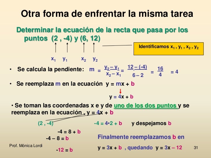 Luego con la pendiente que hallamos y con uno de los puntos, remplazamos en la ecuación principal y=mxb y despejamos b Una vez hallada la pendiente (m) y el intercepto con el eje Y (b) remplazamos de nuevo en la ecuación y=mxb dejando X y Y como variables Ejemplo 1 Hallar la ecuación de la recta que pasa por los puntos (4 , 8) y (2 , 4). Slope in “y=mx b” Pick one of your points and substitute it in for “x” and “y” to solve for “b” Take your “m” and “b”, and put them into “y=mx b” form Ex 5 Nat hires a cleaning service For 4 hours of cleaning, they charge $112 For 6 hours of cleaning, they charge $144. In Uruguay the equation is usually written as y = ax b or y = mx n, and the "slope" is called "pendiente", coeficiente angular", or "parametro de direccion" It is not known why the letter m was chosen for slope;.